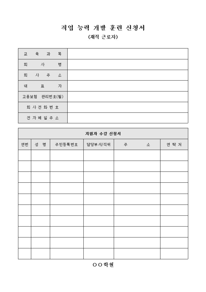 9,000원/월재직 근로자 중 직업 능력 개발 훈련을 받고자 하는 인원들을 기록하여 신청하는 내용의 직업 능력 개발 훈련 신청서 서식입니다. 재직 중인 회사에 대한 사항과 개발 훈련에 지원하고자 하는 인원들의 인적사항을 기재할 수 있습니다.