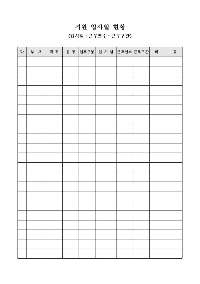 9,000원/월직원의 입사일과 근무연수 기간을 확인할 때 사용하는 직원 입사일 현황입니다.