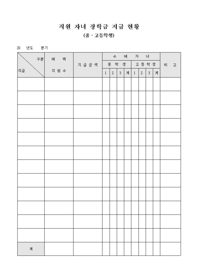 9,000원/월중, 고등학생 자녀를 키우는 직원의 현황을 파악하여 장학금을 지급할 때 사용하는 현황표 입니다. 지급금액과 혜택직원수의 확인이 가능합니다.