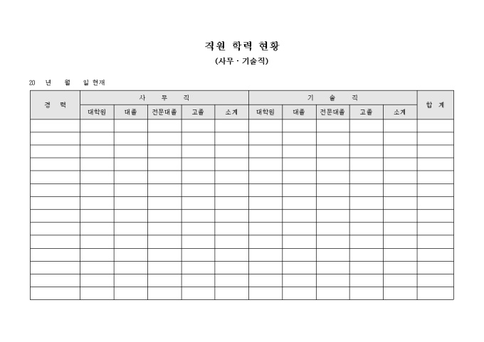9,000원/월사무직, 기술직에서 사용하는 직원 학력현황 입니다. 직원의 학력을 조사할 때 사용하며 경력에 따른 현황을 조사할 수 있습니다.