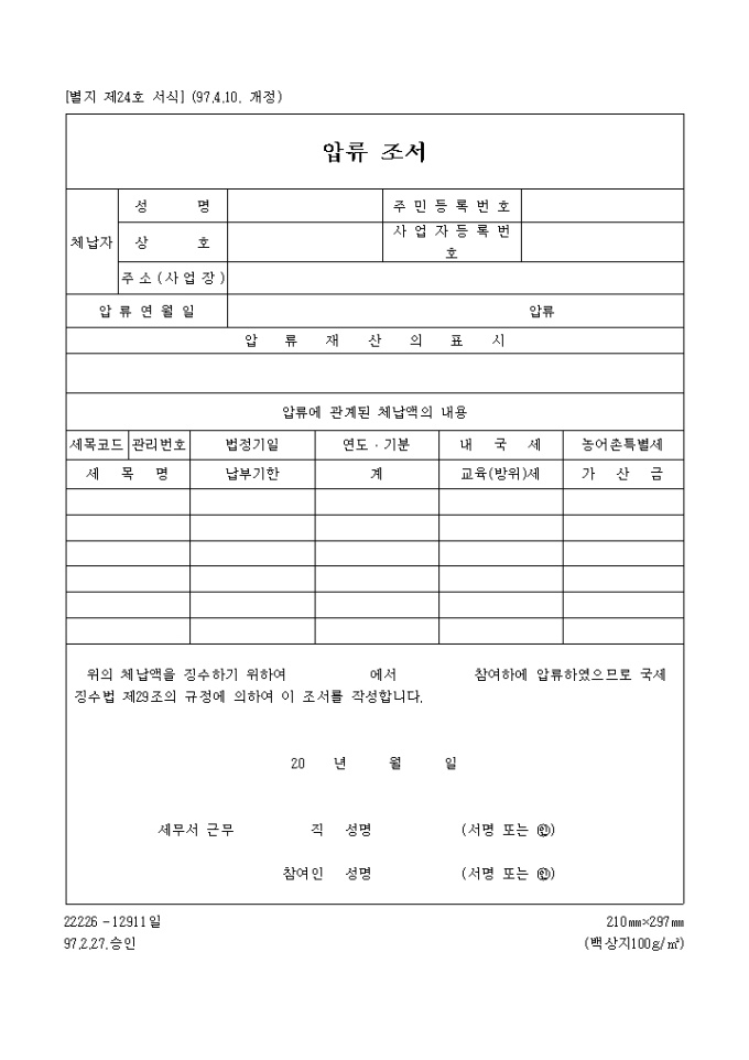 국세징수법 제24호 압류조서
