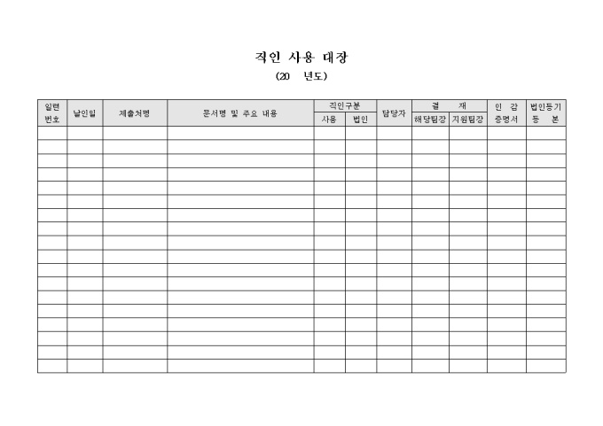 연간 직인 사용내용을 확인할 수 있는 직인 사용대장입니다. 날인날짜와 제출처명을 기록해야 합니다.