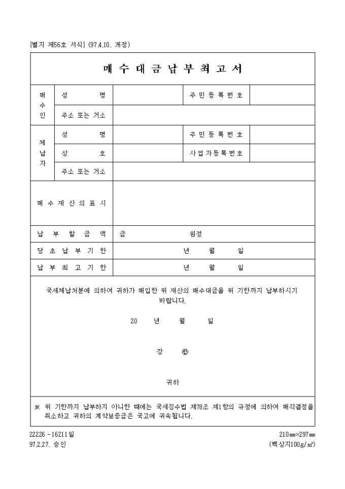 [별지 제56호 서식] 매수대금납부최고서 양식입니다. 국세체납처분에 의하여 귀하가 매입한 위 재산의 매수대금을 위 기한까지 납부하시기 바랍니다. ...