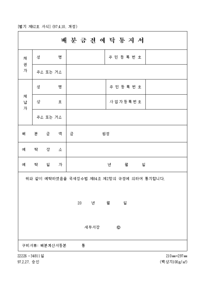 [별지 제62호 서식] 배분금전예탁통지서 양식입니다. 예탁하였음을 국세징수법 제84조 제2항의 규정에 의하여 통지하실때 사용하는 양식입니다.
