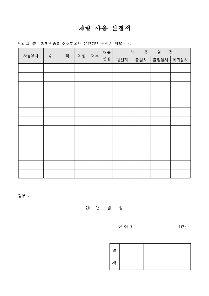 9,000원/월2부로 나누어 사용이 가능한 차량 사용 신청서입니다. 차량 사용기간과 사용목적의 기입이 가능합니다.