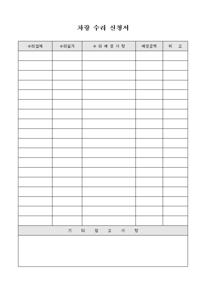 9,000원/월차량의 사고 및 소모품으로 인한 수리비 청구시 사용하는 차량수리비 신청서입니다. 수리업체와 수리가격의 기입이 가능합니다.