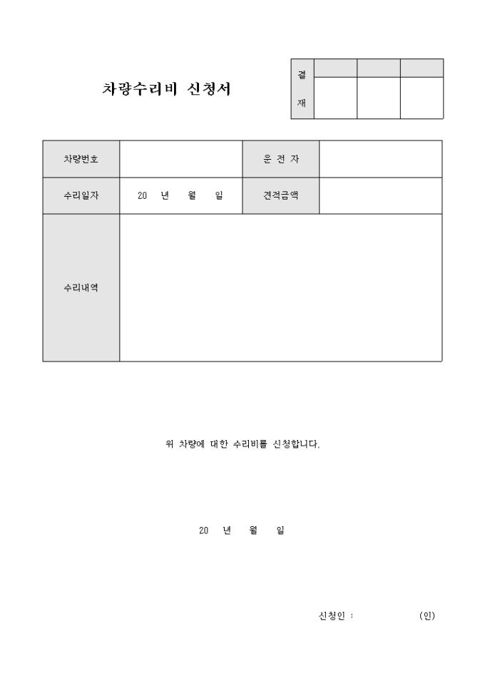 9,000원/월차량의 사고 및 소모품으로 인한 수리비 청구시 사용하는 차량수리비 신청서입니다. 견적금액과 수리내역의 작성이 가능합니다.