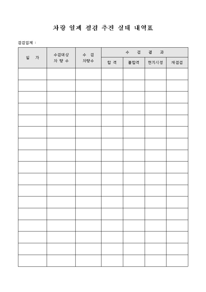 다수의 차량을 일제 점검 추진하고자 할 때 사용하는 문서입니다. 일자별 수검 수검대상 차량 수와 수검 차량수의 기록이 가능하고 수검결과를 기록할 수 있는 문서입니다.