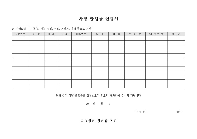 차량 출입증 신청서(센터용)