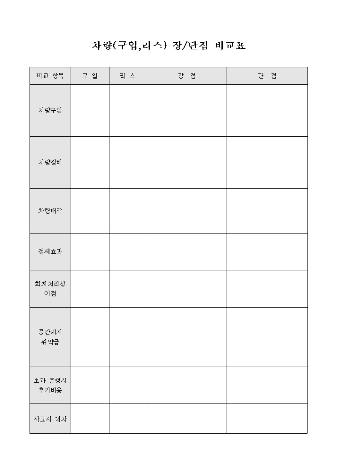 9,000원/월차량의 구입과 임대시 장점과 단점을 항목별 비교가 가능하도록 구성된 비교표입니다.