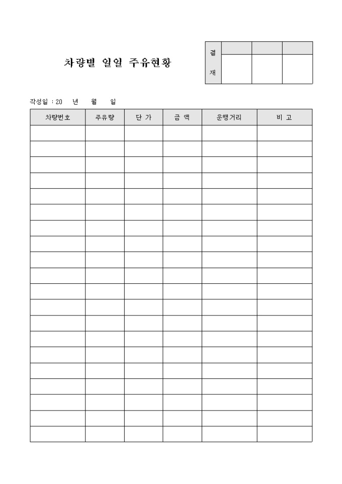 9,000원/월다수차량의 일일 주유현황을 확인하고자 할 때 사용하는 차량별 일일 주유현황표 입니다. 차량번호와 주유량의 확인이 가능합니다.