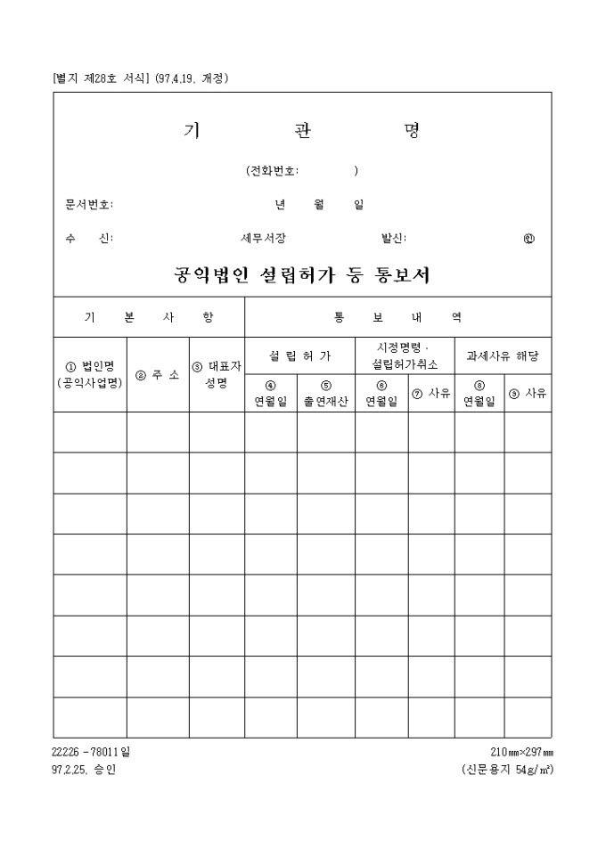 공익법인설립허가등통보서 양식입니다.