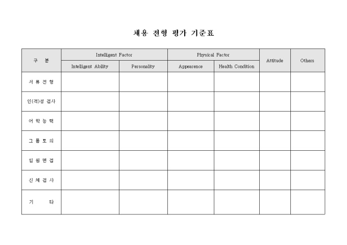 9,000원/월채용 전형의 평가 기준을 마련하기 위해 사용하는 평가 기준표 입니다. 서류전형과 어학능력, 임원면접등의 기록이 가능합니다.