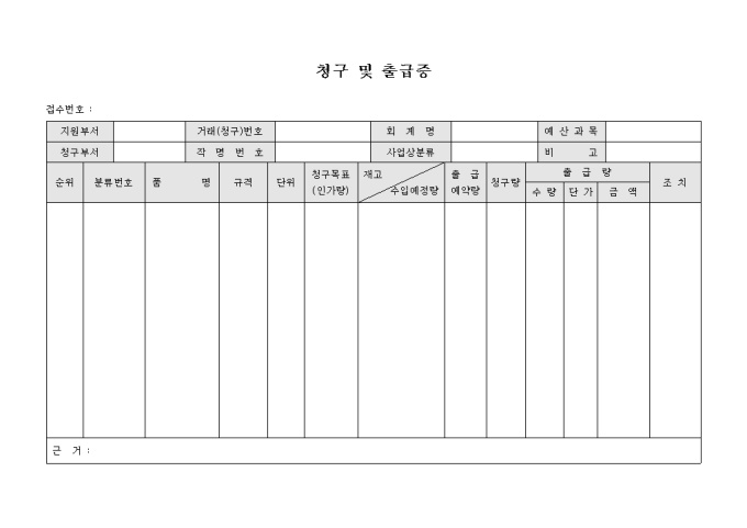 제품의 청구 및 출급 사항을 확인하는 청구 및 출급증 양식으로 제품의 품명, 규격, 단위와 청구목표, 재고, 청구량, 출급량 등을 기재하여 확인할 수 있습니다.