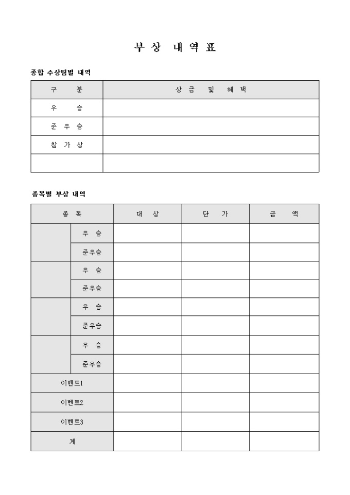 9,000원/월체육 대회 결과에 따라 수여하는 부상 내역을 기록할 수 있는 부상 내역표 양식입니다. 종합 수상팀별 내역과 종목별 부상 내역을 기재할 수 있습니다.