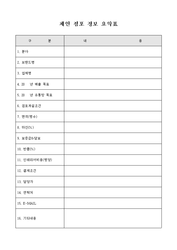 체인 점포의 정보를 구분에 따른 내용을 기록하고 요약 할 때 사용하는 정보 요약표 입니다.