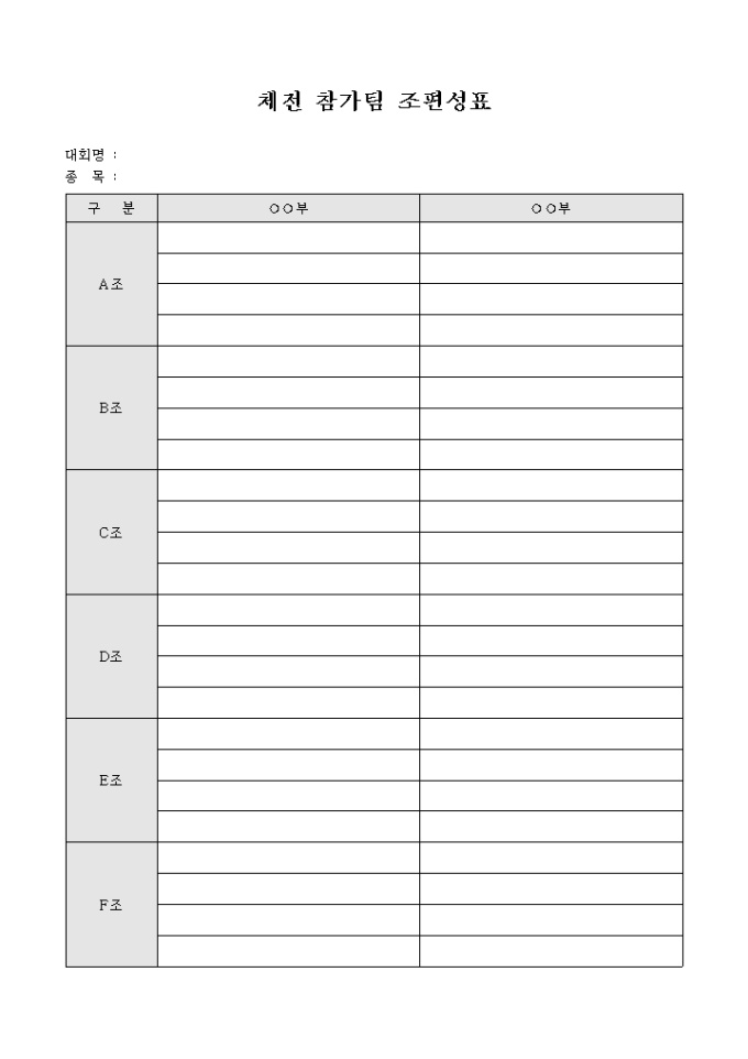 9,000원/월체전에 참가한 팀의 조편성을 일목요연하게 파악하기 위하여 만들어졌으며 부문별로 6개조, 4개팀으로 편성이 가능토록 제작된 서식입니다.