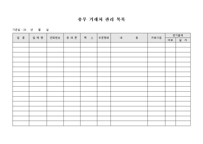 9,000원/월총무 거래처 관리 목록입니다. 업종, 업체명, 연락처, 결제 일 등으로 구성되어 있습니다.