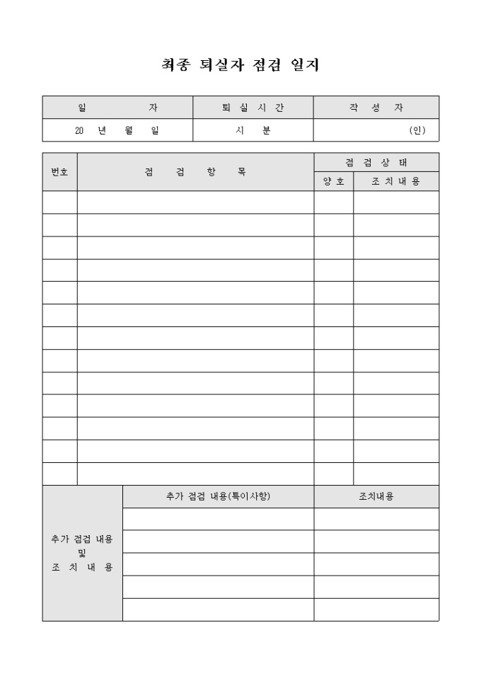최종 퇴실자의 퇴실시 점검항목별 점검상태와 퇴실시간등을 기록 할 수 있는 최종 퇴실자 점검일지 입니다.