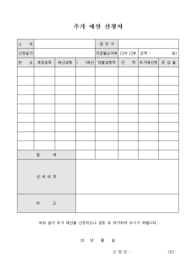 9,000원/월예산이 부족하여 추가로 예산신청을 할 때 계정과목별 잔액 등을 기록하여 추가 예산 신청시 사용합니다.