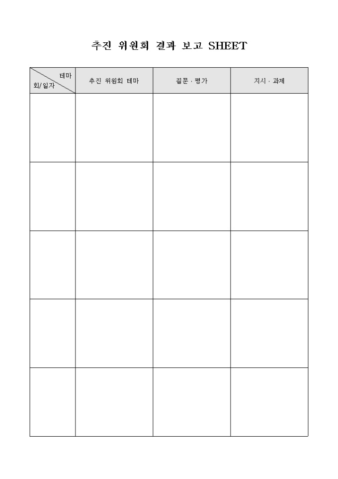9,000원/월추진위원회의 회의 일자별로 회의 테마 및 질문, 평가, 지시, 과제 등의 사항을 결과를 보고하기 위하여 작성하는 추진 위원회 결과 보고 SHEET 양식입니다.