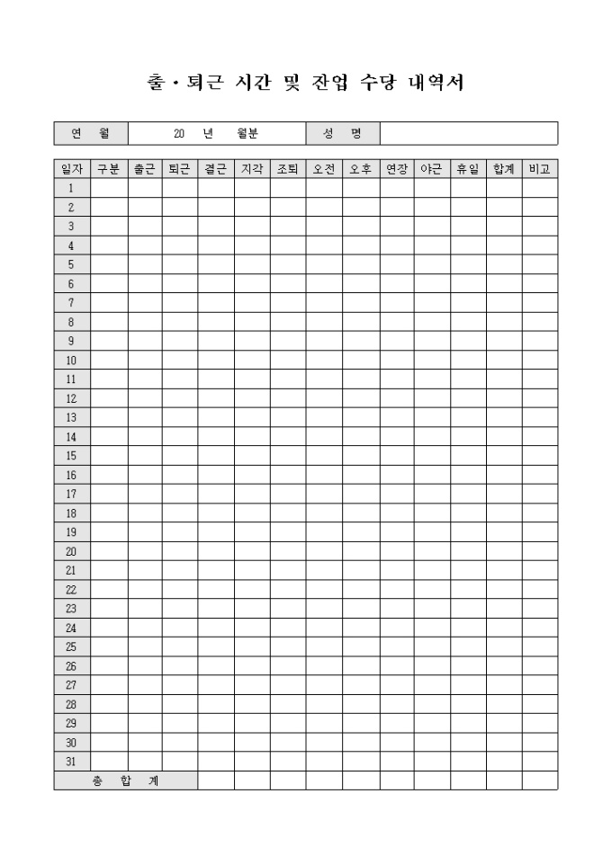 출, 퇴근 시간 및 잔업 수당내역을 일자별로 확인이 가능하도록 구성된 수당내역 현황표 입니다.