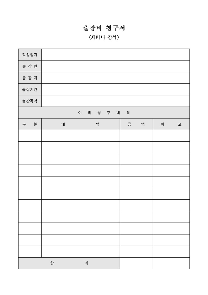 세미나 참석과 관련 여비 청구시 사용하는 출장비 청구서 입니다.