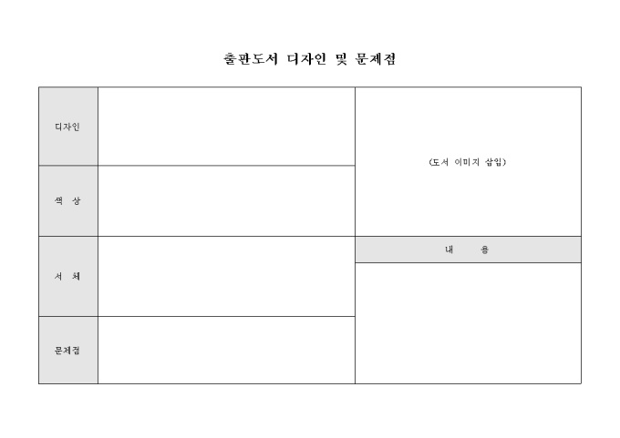 9,000원/월출판 도서의 디자인과 색상, 서체 사항을 기재하고 해당 사항에 대한 문제점 및 내용을 기재할 수 있는 출판 도서 디자인 및 문제점 서식입니다.