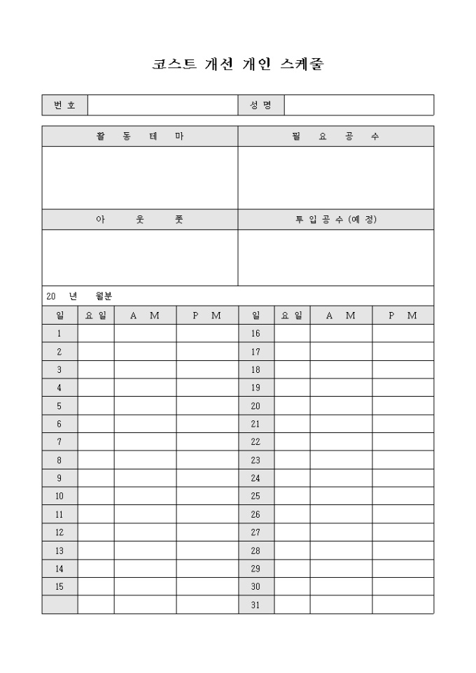 9,000원/월업무에 소요되는 비용의 절감 등의 비용 개선을 위하여 개인 스케줄을 작성하는 코스트 개선 개인 스케줄 양식입니다. 활동테마와 필요공수, 아웃풋, 투입공수와 월간의 스케줄을 일별로 작성할 수 있도록 구성되어 있습니다.