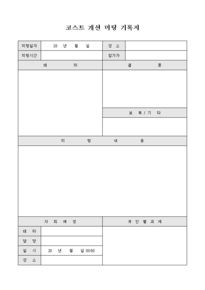 9,000원/월비용 개선을 위한 회의 실시 후 회의 내용을 기록하기 위한 코스트 개선 미팅 기록지 양식입니다. 비용 개선을 위한 테마와 회의의 결론, 미팅 내용과 개인별 과제 등을 기재할 수 있습니다.