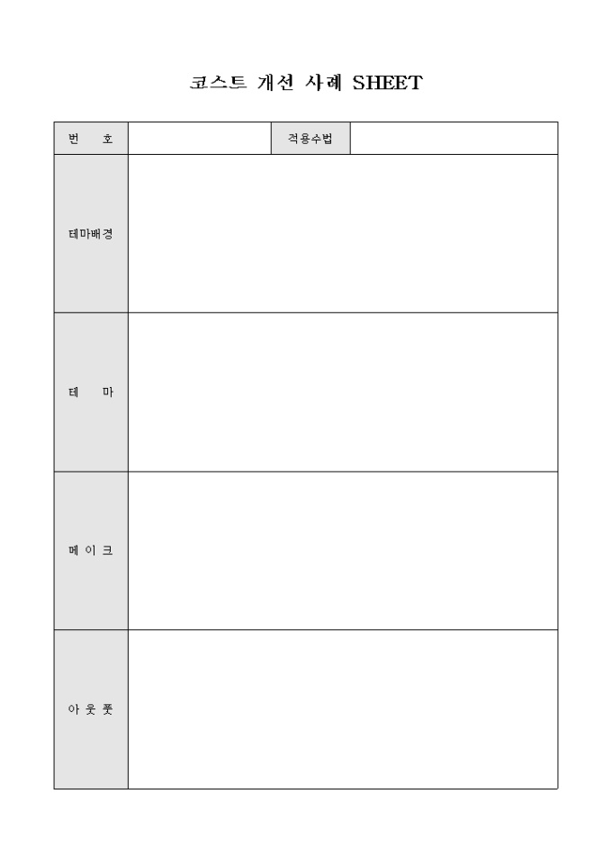 비용 절감 등의 비용 개선 사례를 소개하기 위하여 작성하는 코스트 개선 사례 SHEET 양식입니다. 테마배경과 테마, 메이크, 아웃풋 등의 항목을 기재할 수 있습니다.