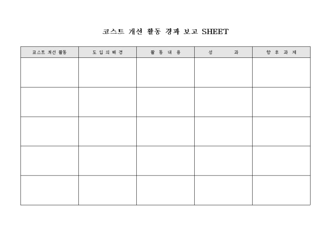 9,000원/월현재 진행하고 있는 코스트 개선 활동에 대하여 도입 배경 및 활동 내용, 성과, 향후 과제 등의 사항을 작성하여 활동 경과를 보고하기 위한 코스트 개선 활동 경과 보고 SHEET 양식입니다.