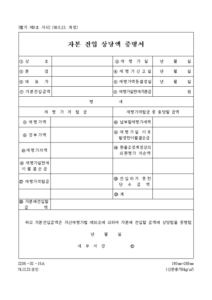 [별지 제8호 서식] 자본전입상당액증명서 양식입니다. 자본전입금액은 자산재평가법 제30조에 의하여 자본에 전입할 금액에 상당함을 증명하실때 사용하는 양식입니다.