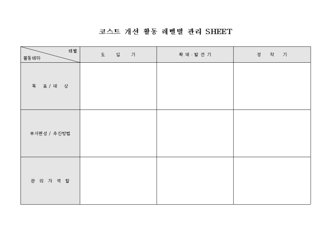 코스트 개선의 활동 테마에 대하여 레벨별로 관리하기 위하여 작성하는 코스트 개선 활동 레벨별 관리 SHEET 양식으로 목표/대상, 부서편성/추진방법, 관리자 역할 등의 활동 테마에 대하여 도입기, 확대?발전기, 정착기 등의 레벨별로 그 내용을 기재하여 관리할 수 있습니다.