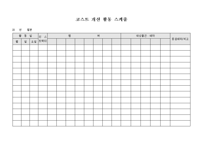 9,000원/월활동일 별로 코스트 개선 활동에 참여하는 인원과 대상물건 및 테마에 대하여 기록하여 스케줄을 관리하기 위한 코스트 개선 활동 스케줄 양식입니다.