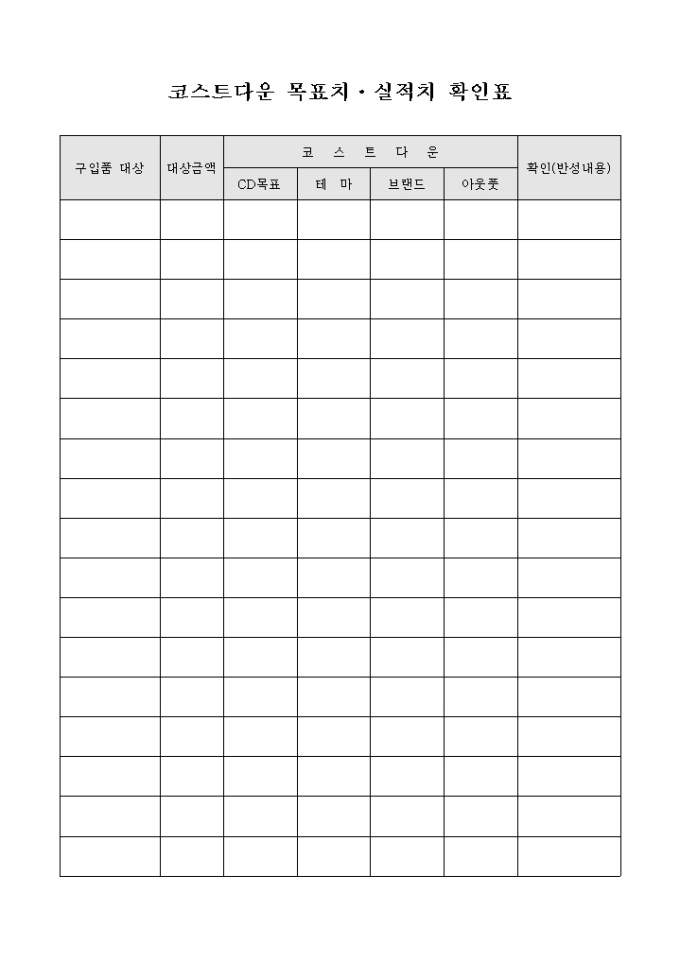 구입품 대상에 대한 코스트다운 목표치와 실적치를 확인하기 위하여 대상금액, 코스트다운 내역, 확인 사항을 기재할 수 있도록 구성된 코스트다운 목표치?실적치 확인표 양식입니다.