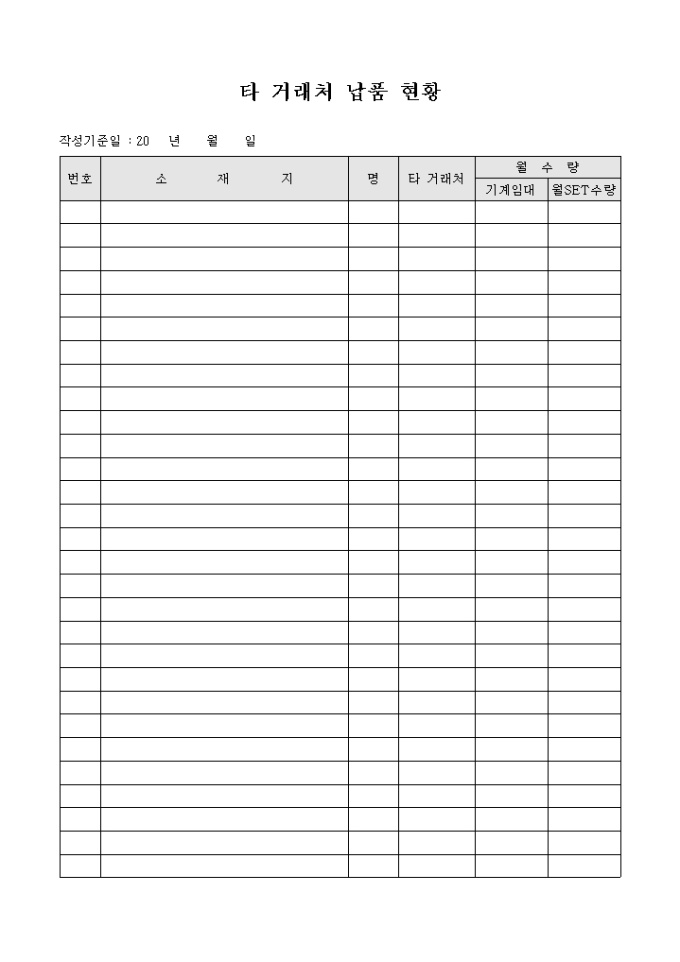 타 거래처와의 납품 상황을 기재하여 현황을 파악하기 위한 타 거래처 납품 현황 양식입니다. 거래처의 소재지와 이름, 월 거래 수량 등의 항목을 기재할 수 있습니다.