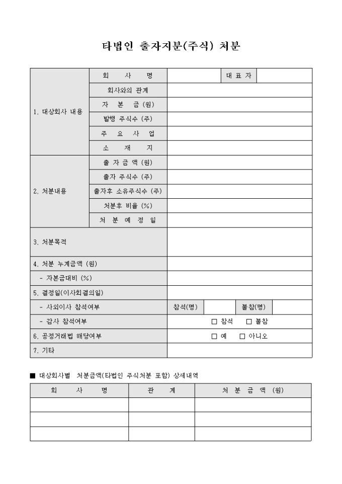 9,000원/월다른 회사의 출자지분에 대한 처분 내용을 기록하는 타법인 출자지분(주식) 처분 서식으로 대상회사의 내용과 주식의 처분내용 및 목적, 금액 등에 대하여 기재할 수 있습니다.