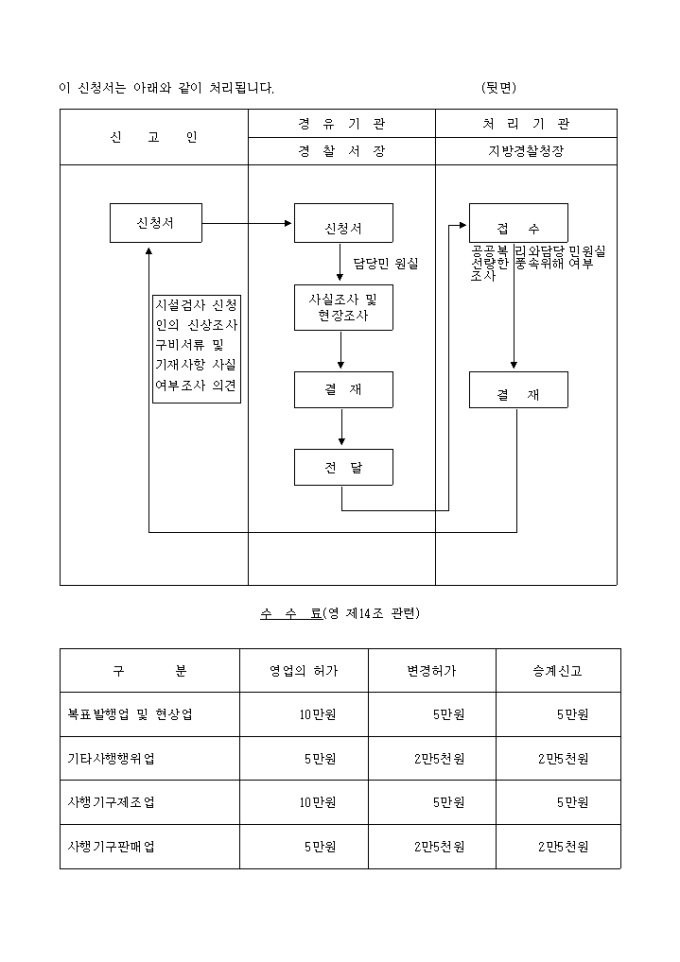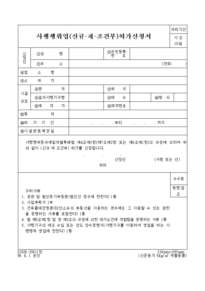 9,000원/월사행행위등규제및처벌특례법 제4조제1항(제7조제2항 또는 제8조제1항)의 규정에 의한 사행행위업(신규,재,조건부)허가신청서입니다.