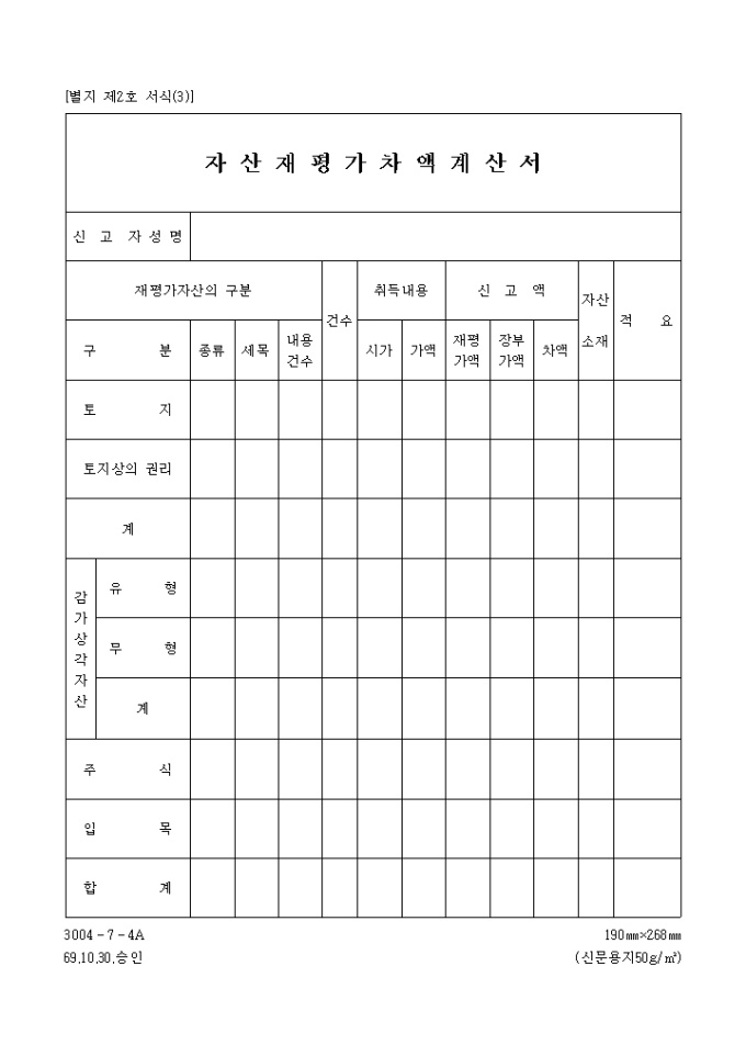 9,000원/월[별지 제2호 서식(3)] 자산재평가차액계산서 양식입니다. 재평가자산의 구분, 건수, 취득내용, 신고액, 자산소재, 적요의 항목으로 구성된 양식입니다.