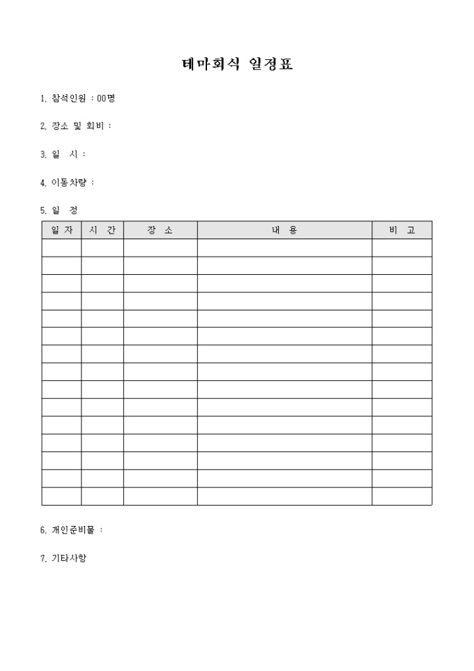 테마 회식시 사용하는 테마회식 일정표입니다. 인원과 장소, 일시, 이동차량등 회식일정이 기록되어 있습니다.