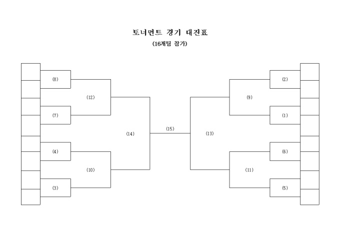9,000원/월토너먼트 경기 대진표를 구성하고자 할 때 사용하기 위해 만들어졌으며 총 16개 참가팀의 대진표를 작성할 수 있습니다.