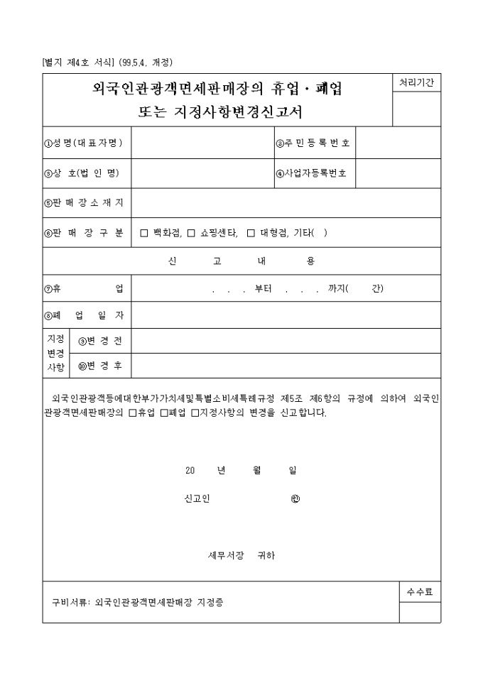 외국인관광객면세판매장의휴업,폐업또는 지정사항변경신고서 양식입니다.