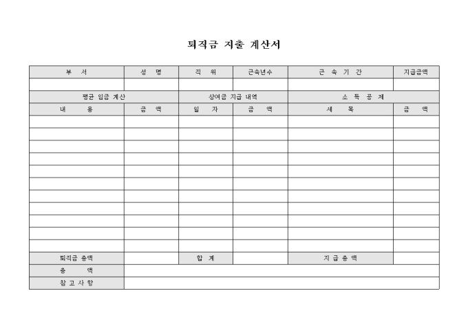 회사에서 사용하는 문서입니다. 퇴직금 지출내용을 기록하고 계산하기 위해 만들어진 퇴직금 지출 계산서입니다.