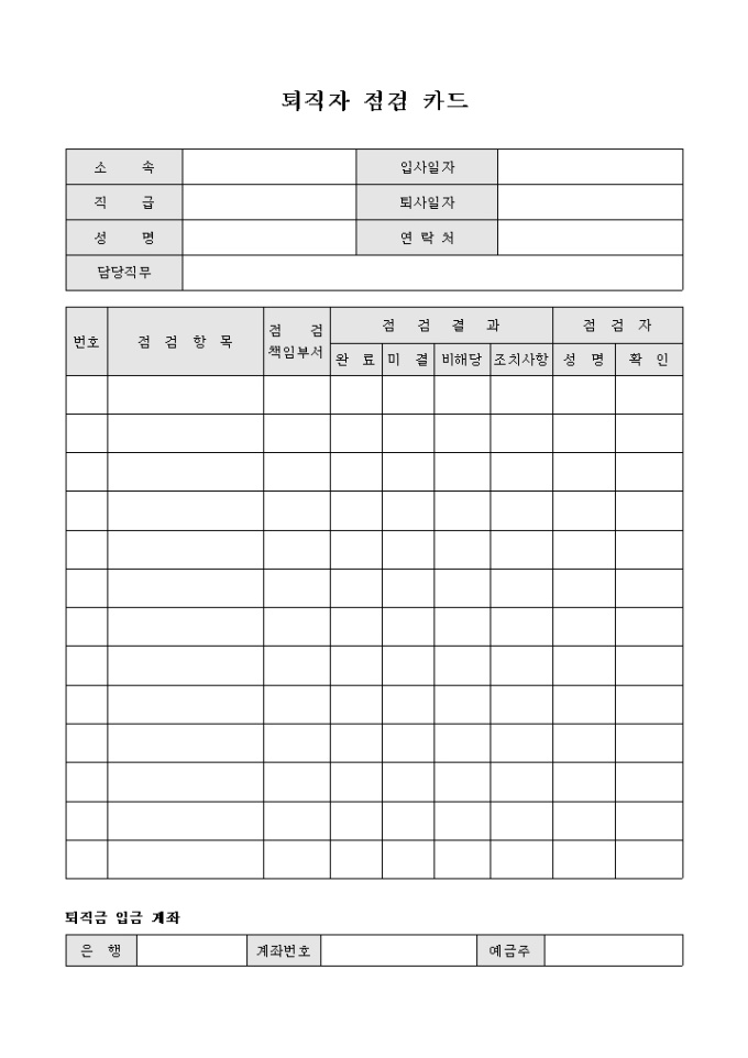 9,000원/월퇴직시 점검결과를 바탕으로 하여 부족한 부분들을 기록 할 수 있는 퇴직자 점검카드 입니다.