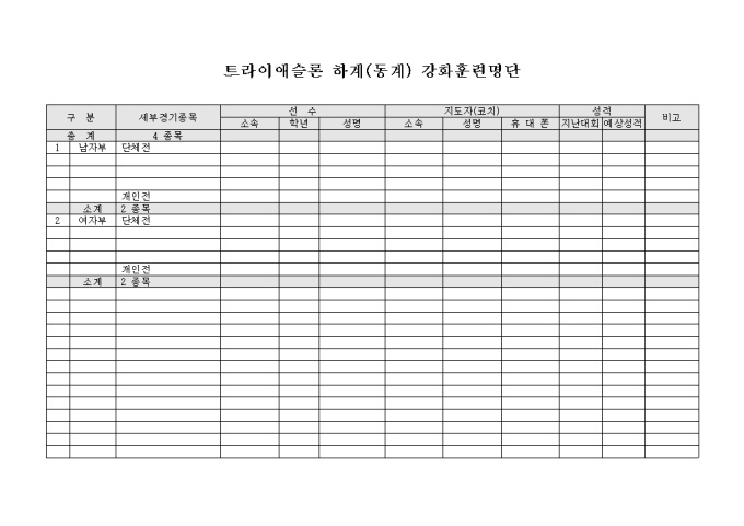 트라이애슬론 부원중 하계(동계) 강화훈련에 참가하는 선수와 지도자의 명단을 관리하기 위해 만들어졌으며 종목별로 구분이 가능하며 지난대회 성적과 이번대회 예상 성적을 기입할 수 있게끔 제작된 서식입니다.