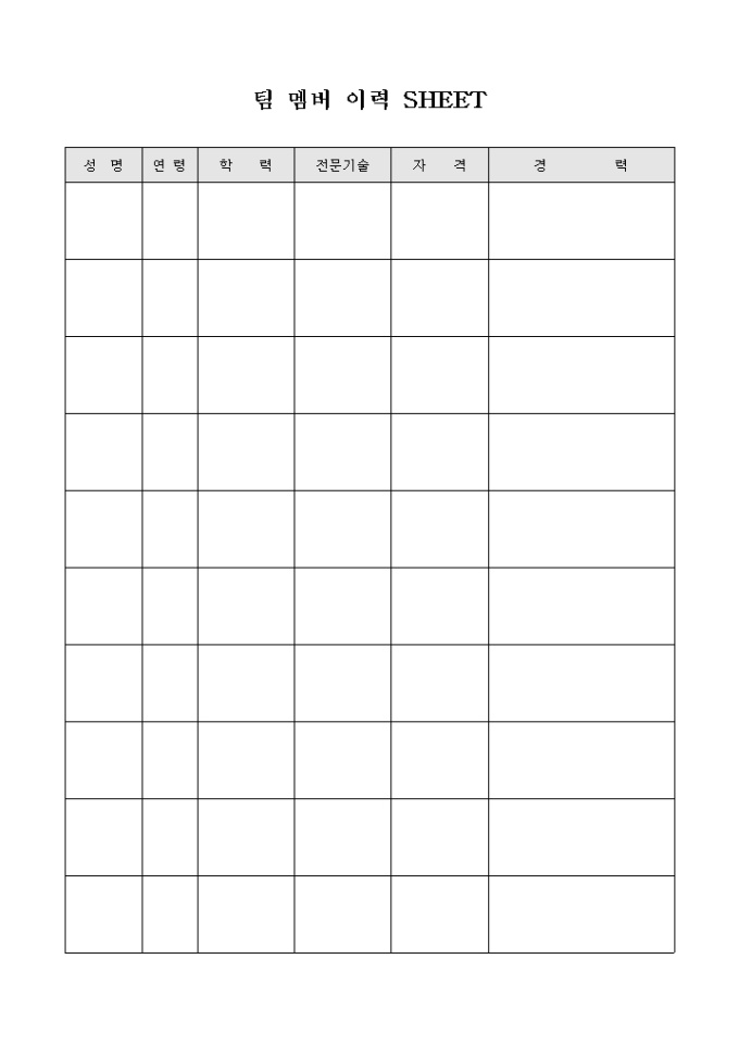 팀 멤버에 대한 이력 사항을 작성하여 관리하기 위한 팀 멤버 이력 SHEET 양식으로 멤버들의 성명, 연령, 학력, 전문기술, 자격, 경력 등의 항목을 작성할 수 있도록 구성되어 있습니다.