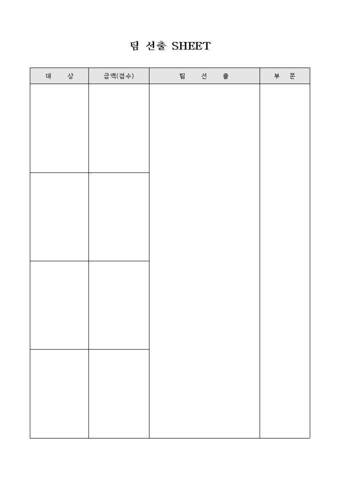 9,000원/월대상별 금액을 기재하여 해당 업무를 담당할 팀을 선출하기 위한 팀 선출 SHEET 양식입니다.