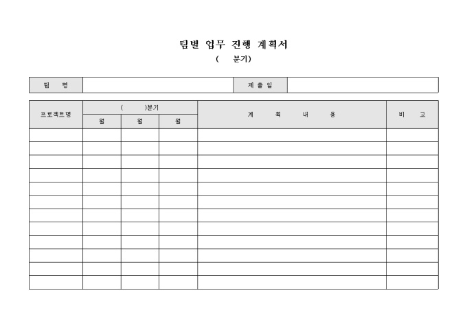 9,000원/월팀별 분기 업무를 진행하고자 할 때 사용하는 업무 진행 계획서입니다. 프로젝트의 월별 계획내용을 기록 할 수 있습니다.