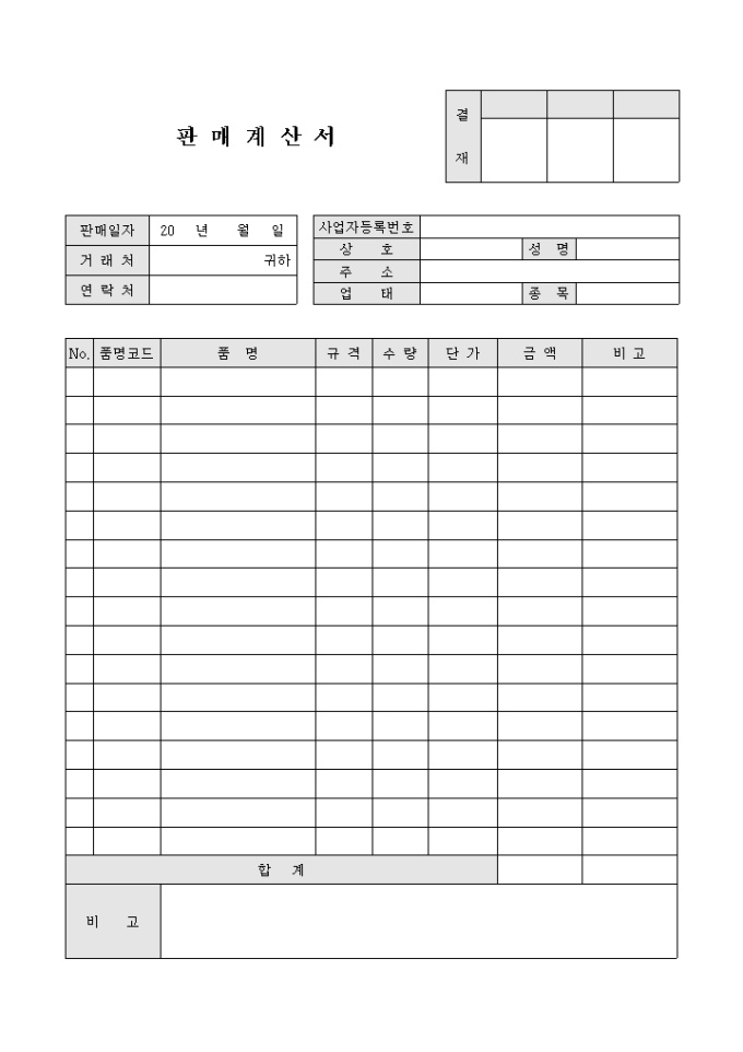 9,000원/월판매 계산서입니다. 판매할 물품의 품명과 규격, 수량, 단가를 기록 한 판매 계산서입니다.